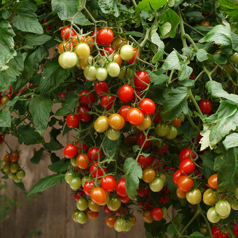 Busktomat der med stor fordel kan dyrkes i ampelpotter den får små, runde tomater med en dyb rød farve og skinnende overflade.